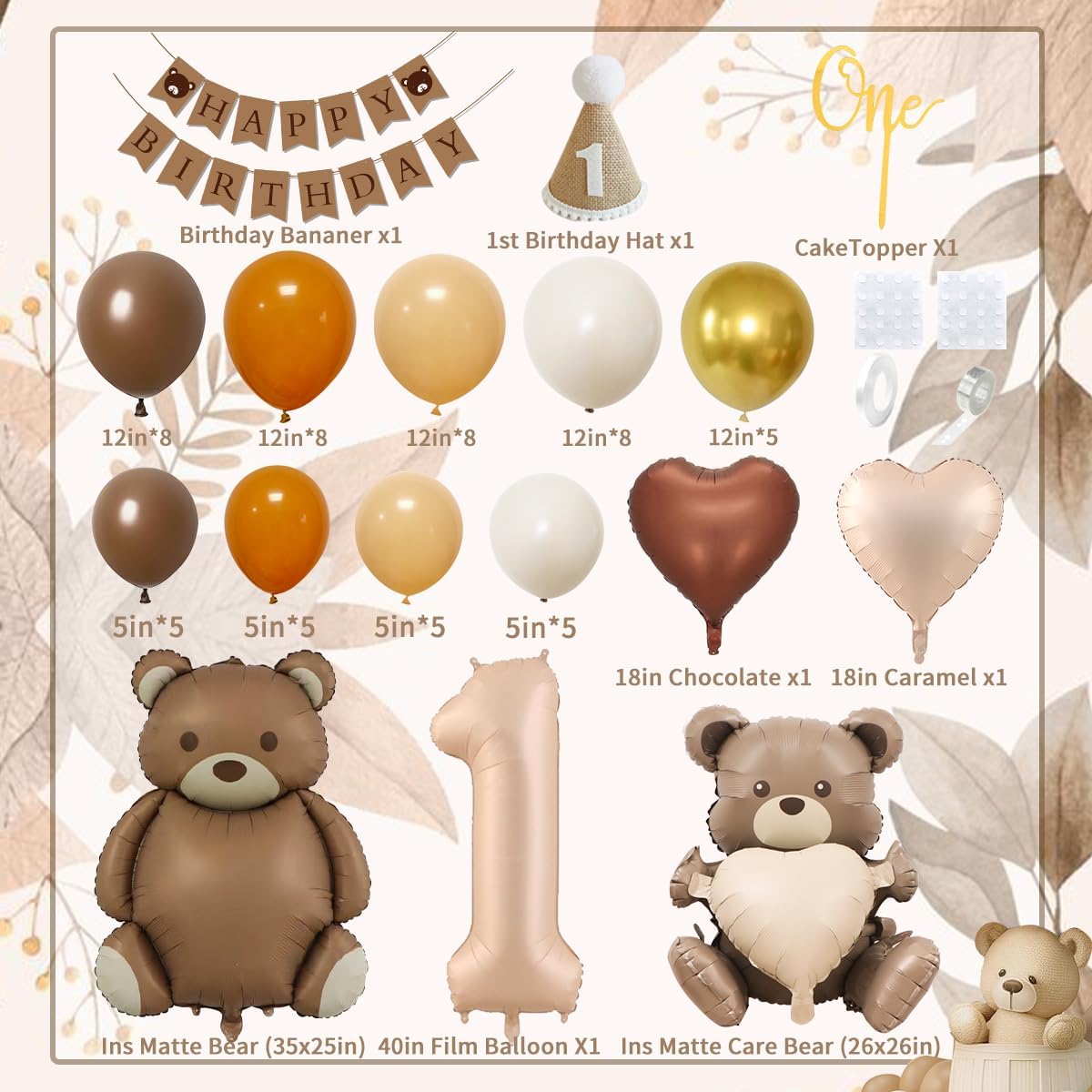 • Little Bear Birthday Decorations: This product contains: 57 latex balloons, 1 little bear HAPPY BIRTHDAY banner, 2pcs Little Bear foil balloons, 3pcs heart balloons, 1pcs 1st birthday hat, 1pcs One cake topper, 2pcs dot glue, 1pcs balloon chain, 1pcs ribbon. Note: One of the bear need assembly.