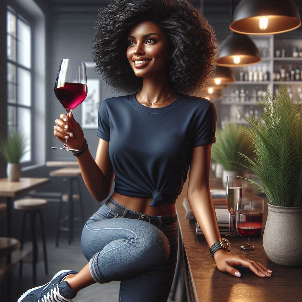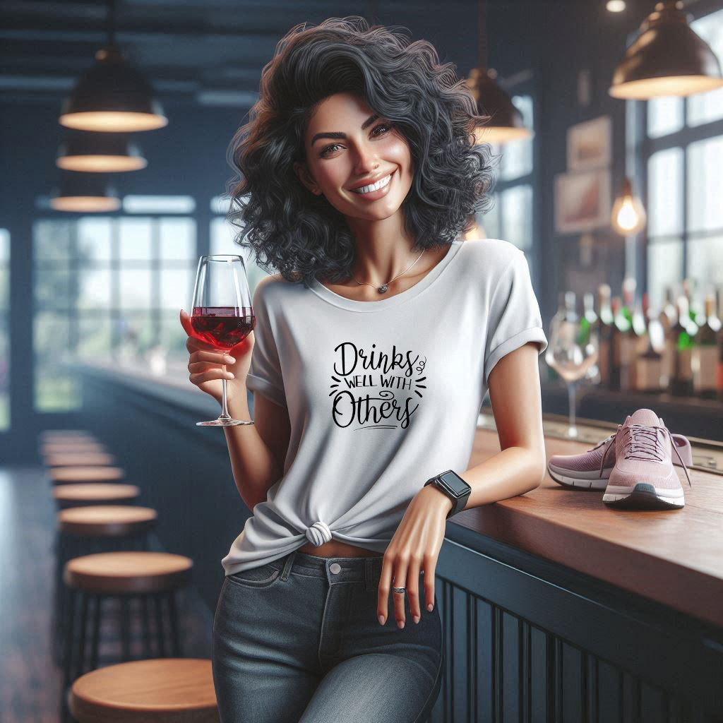 Text: "Show off your social side with our 'Drinks Well With Others' T-shirt. Made for those who enjoy good company and great times, this shirt is a perfect conversation starter and a must-have for any social butterfly."
