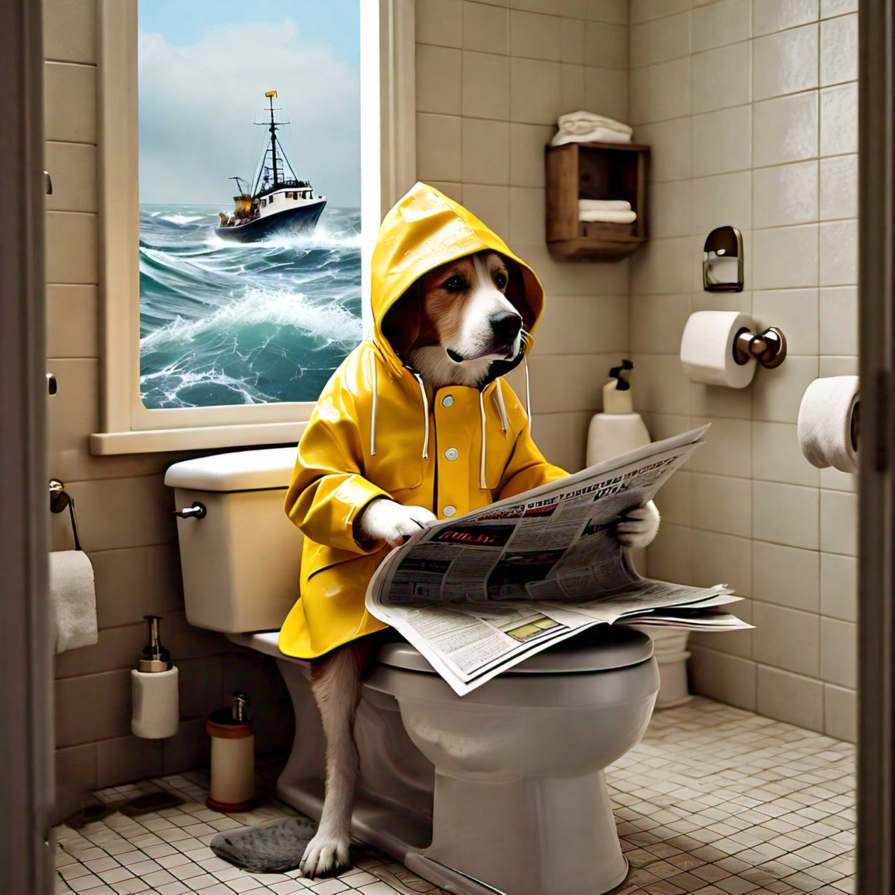 Perfect for dog lovers, humor enthusiasts, or anyone looking to inject a bit of personality into their space, 'Canine Contemplation' is sure to spark conversation and bring smiles to all who see it. Whether displayed in your living room, office, or even bathroom, this delightful print adds a playful touch to any room.